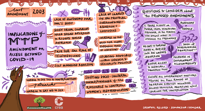 What is the historical and current legal landscape of abortion in India? How does the criminalisation of abortion affect reproductive autonomy? What does the existing law on abortion state? What are the new amendments that were approved by the Lower House of the India Parliament? What are the implications for accessing sexual and reproductive health services in a crisis situation such as COVID-19? The graphic representations of a three-part webinar series organised by Common Health and CREA address these questions and attempt to build an understanding of the decriminalisation of abortion and how it could ensure access to safe, affordable, timely and rights-based services.