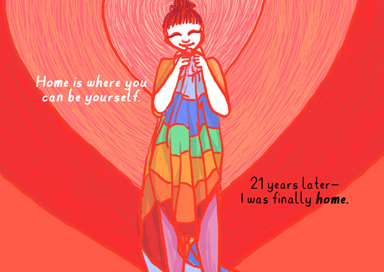 For a lot of queer people, ‘home’ can hold complicated meanings. The space of one’s home can be fraught with bigotry and alienation, and be far from safe or comforting. And so, there is a quest to find alternate ‘homes’, to find a space where we feel truly accepted, safe and protected. These alternate homes may take multiple forms – people, a community, physical places, the online world, pride parades – reiterating the notion that a safe space doesn’t have to be physical, or static, or limited, that it can take varying forms, depending on each individual. Teenasai Balamu and Siddhi Surte’s comic, Finding Home, beautifully illustrates the myriad ways in which a safe, inclusive ‘home’ can manifest itself for those who are queer.