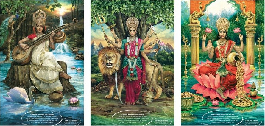 The elaborate artwork works a little better without the accompanying message. It is a plush imitation of traditional goddess images that hang in Hindu homes. Now imagine waking up one morning to find these goddesses waiting for you with bruises on their faces. The campaign is hoping to capitalise on the resulting shock, and perhaps even the resulting shame.