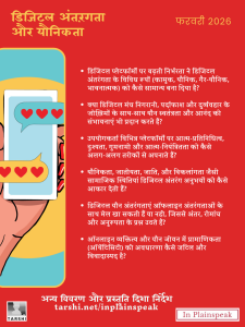 हम में से अधिकांश लोगों के लिए डिजिटल माध्यमों तक पहुंच और उन पर निर्भरता लगातार बढ़ती जा रही है, और सोशल मीडिया, गेमिंग प्लेटफॉर्म, डेटिंग ऐप्स आदि पर डिजिटल अंतरंगता – कामुक, यौनिक, गैर-यौनिक, भावनात्मक – हमारे लिए कोई नई बात नहीं है। डिजिटल स्थान यौन स्वतंत्रता और आनंद की संभावनाएं तो प्रदान करते हैं, लेकिन साथ ही निगरानी, ​​पर्दाफाश और हिंसा का ख़तरा भी पैदा करते हैं। तो हम अपने अनुभव को बेहतर बनाने के लिए क्या कर सकते हैं? हम विभिन्न प्लेटफॉर्मों पर आत्म-प्रतिनिधित्व, दृश्यता, गुमनामी और आत्म-नियंत्रितता को कैसे अलग-अलग तरीक़ों से इस्तेमाल करते हैं? क्वीयर होना, अयौनिक होना, यौनिकता, जातीयता, जाति, और विकलांगता जैसे कारक डिजिटल अंतरंगता के निर्माण और उसे बनाए रखने में क्या भूमिका निभाते हैं? क्या डिजिटल मंचों द्वारा प्रदान की जाने वाली यौनिक अंतरंगता हमारे ऑफलाइन जीवन की अंतरंगता के अनुरूप है? क्या ऐसा होना ज़रूरी है, या फिर ऐसा न होने में एक ख़ास रोमांच है? हमारी ऑनलाइन पहचान और हमारे यौन जीवन के संदर्भ में प्रामाणिकता (ऑथेंटिसिटी) क्या है? इन प्लेनस्पीक  का यह अंक कुछ ऐसे प्रष्नों पर विचार-विमर्श करता है।