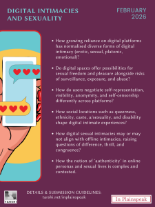Check out details and guidelines to submit contributions for In Plainspeak's February Issue on Digital Intimacies and Sexuality