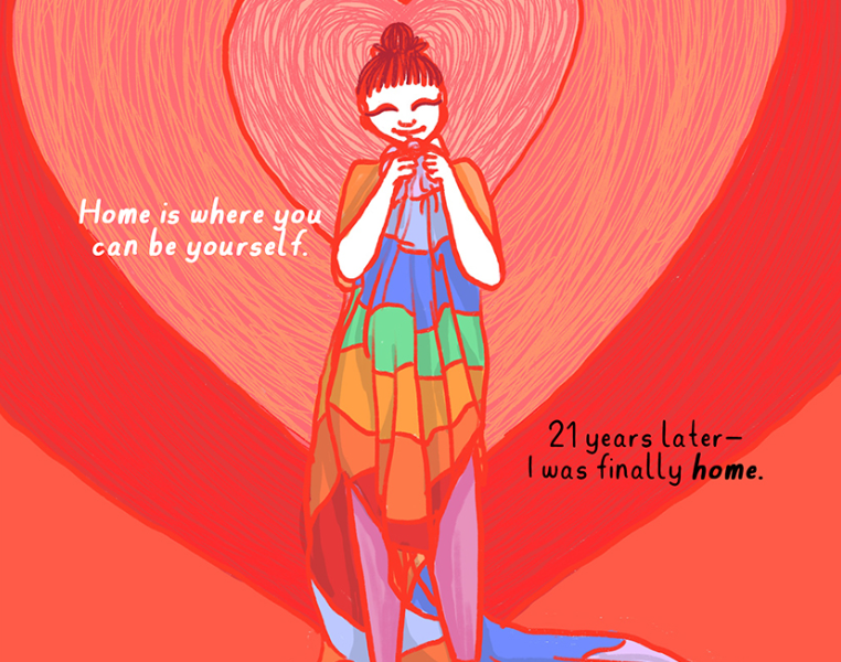 For a lot of queer people, ‘home’ can hold complicated meanings. The space of one’s home can be fraught with bigotry and alienation, and be far from safe or comforting. And so, there is a quest to find alternate ‘homes’, to find a space where we feel truly accepted, safe and protected. These alternate homes may take multiple forms – people, a community, physical places, the online world, pride parades – reiterating the notion that a safe space doesn’t have to be physical, or static, or limited, that it can take varying forms, depending on each individual. Teenasai Balamu and Siddhi Surte’s comic, Finding Home, beautifully illustrates the myriad ways in which a safe, inclusive ‘home’ can manifest itself for those who are queer.