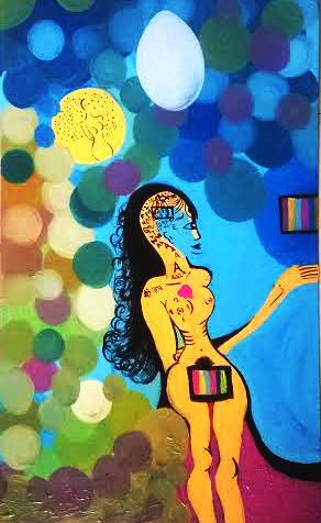 The painting depicts a woman with a television set in place of her reproductive organs who is also watching a television. In terms of sexuality and the media, the painting tries to highlight the fact that a woman’s vagina is used as a form of entertainment, and this same entertaining ‘content’ is being consumed and accepted by the woman. Which is the confusing reality of our media.