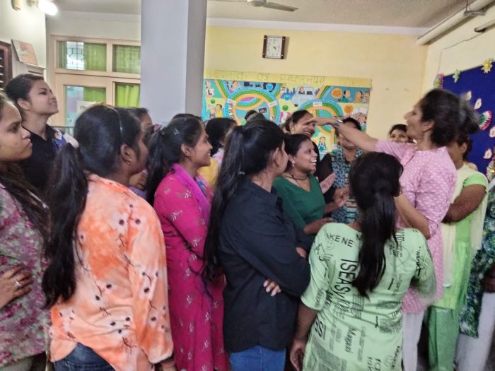 ट्रेनीज़ शर्म और उत्सुकता को दबी-दबी मुस्कान और हंसी में छुपाते हैं, अपने दुपट्टे में, स्कार्फ़ में या फ़िर एक दूसरे के कंधे में! “कांधे से बाहर निकलो और खुल के हंसो, कुछ भी बोलो या पूछो,” – उन्हें जैसे कि ये एक मंज़ूरी, एक छूट, देता है “गंदी बातें” करने का, अपने अनेक असमंजस साफ़ करने का, बहुत हसने का और इन बातों पर पड़े हुए परदे ख़ुद गिराने का।
