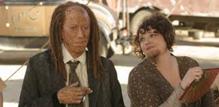 Carnivale triumphs on another front as well. In spite of the ‘deformities’ and painful disfigurations, the members of the travelling freak show display their bodies out of their own free will, and, through their common pride, find a home and a family with each other. They also find complete acceptance, love and sexual satisfaction. In a scene where Lila the bearded woman shares a sensuous kiss with Lodz the mentalist, he seems to admire the growth on her chin rather than seem inured to it. Its shortcoming is its all-White cast, and its failure to challenge racial exploitation within travelling freak shows.