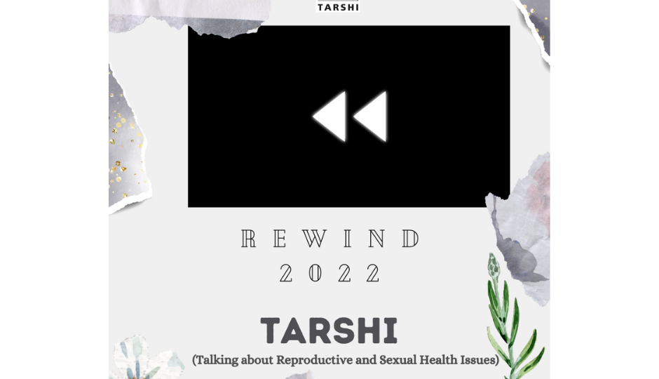 screenshot of first slide of the video with TARSHI's logo, a black rectangle with the 'rewind' symbol on it, with the words 'Rewind 2022' under it. below this is the text TARSHI (Talking About Reproductive and Sexual Health Issues)