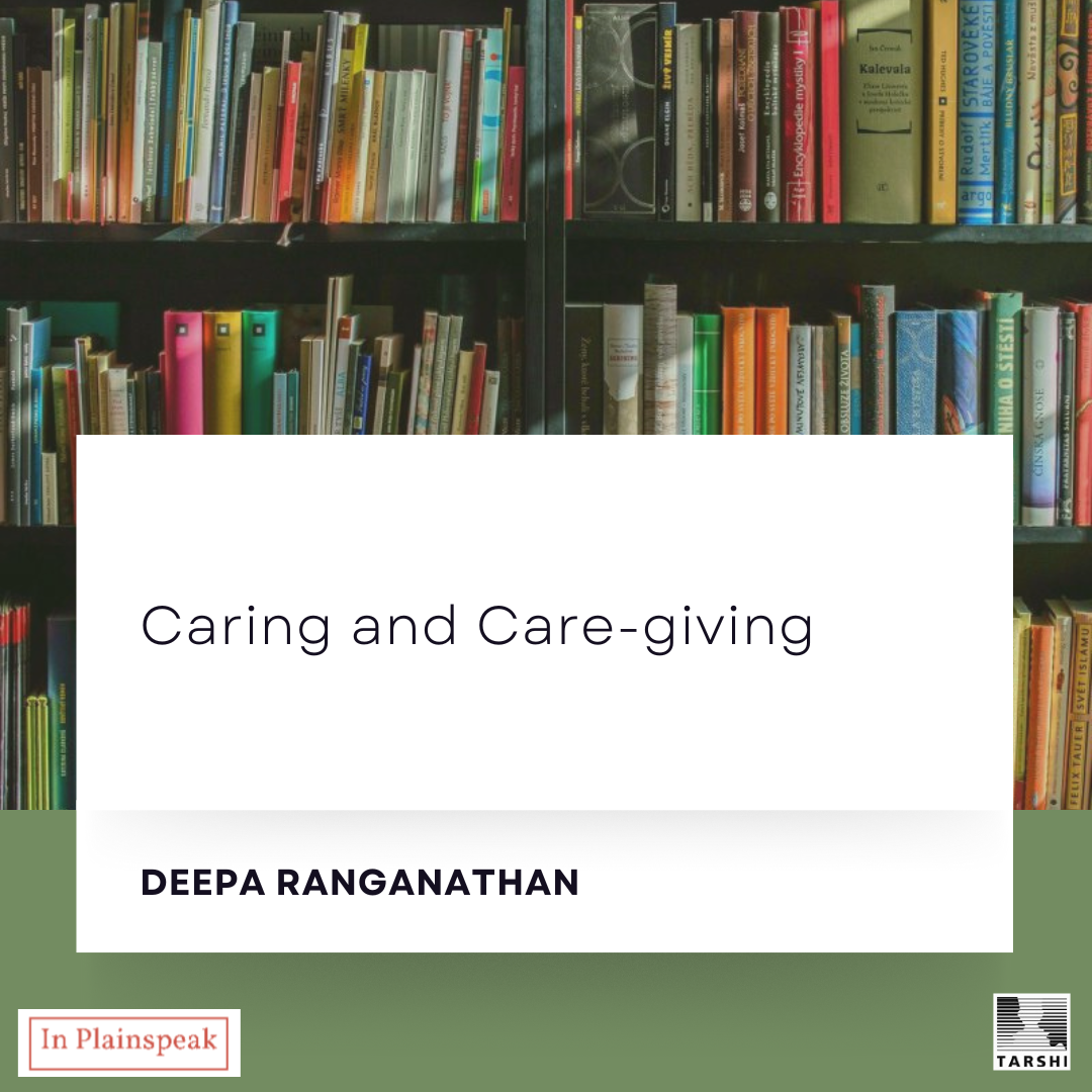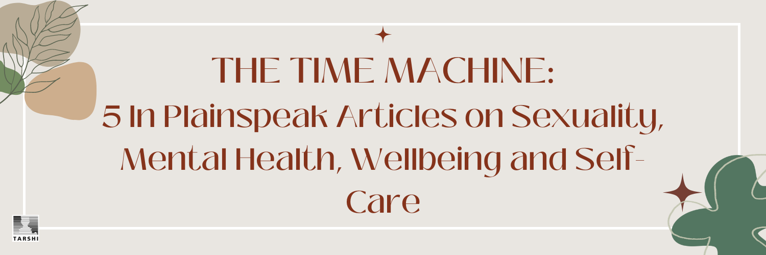 An illustration of the title of the article with a beige background. There are oblong-shaped blobs in peach and sap green on the upper left corner and the lower right corner. At the centre is the logo of TARSHI followed by three verticle rows of squiggly lines and the text that reads "In Plainspeak: Sexuality, mental health, wellbeing and self-care"
