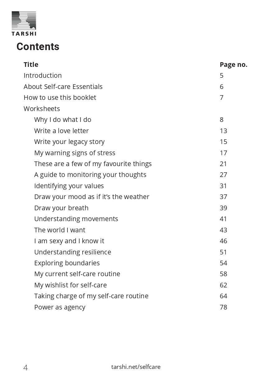 This booklet seeks to guide or accompany you on your self-care journey. In it, you will find worksheets that are simple “exercises” of different kinds. Some worksheets help you identify things that give you joy. A few are to help you understand your emotions, stress, reactions, and responses. Some others will help you reflect on your journey so far so you can think of where you want to go.